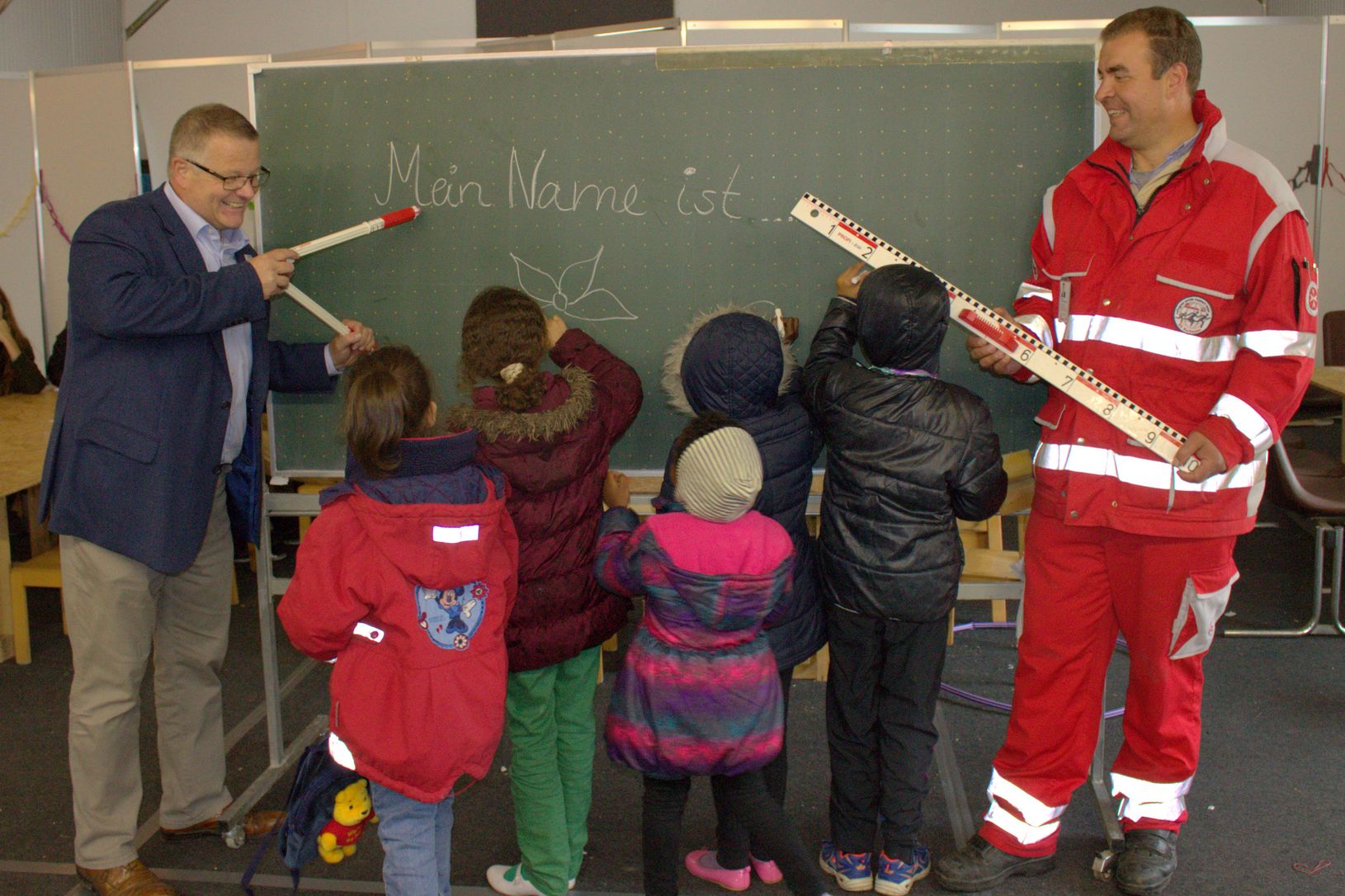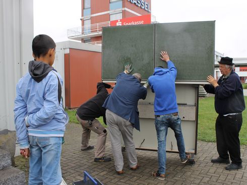Sofort nachdem die Schultafeln in die Unterrichtshalle geschoben wurden, kamen gleich die ersten Flüchtlingskinder und nahmen die Tafeln in Beschlag. Die Kinder malten Blumen und waren mit Begeisterung dabei. Robin Siebert, ehrenamtlicher Helfer in Calden, freute sich riesig über die Spende des BZ. „Zwar haben wir die Erwachsenen und Kinder auch vorher schon unterrichtet, aber wir haben die Worte immer auf DIN A 3-Zettel geschrieben und diese hochgehalten. Das hat nicht gut funktioniert. Jetzt haben wir eigene Schultafeln, das ist fantastisch.“