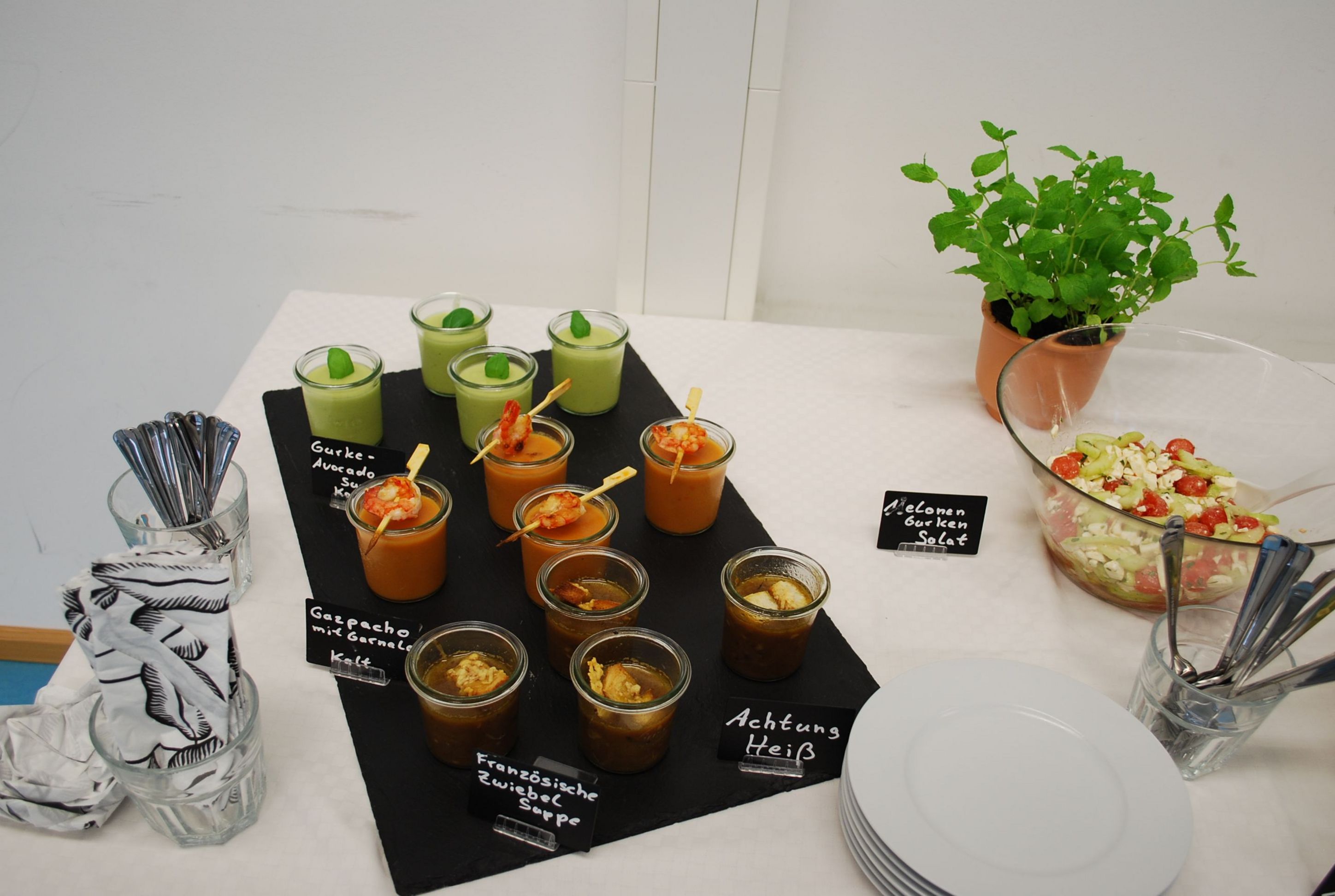 Acht Buffets wurden vergangene Woche kreiert, kalkuliert, hergestellt, vom Prüfungsausschuss begutachtet und schließlich verzehrt. Nach den schriftlichen fachtheoretischen Prüfungen zu Wochenbeginn, wurde im ersten Schritt einem fiktiven Kunden ein Angebot erstellt. Die Prüfungsthemen für die Fachpraxis bekamen die Teilnehmer/-innen zugelost. Diese reichten von der "Verabschiedung in den Ruhestand" bis zur "Gartenparty anlässich eines 40. Geburtstages".