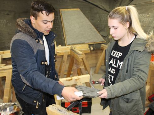 Dachdeckermeisterin und Ausbilderin Marion Mecke erzählt den Mädchen etwas über die Herkunft des Schiefersteins