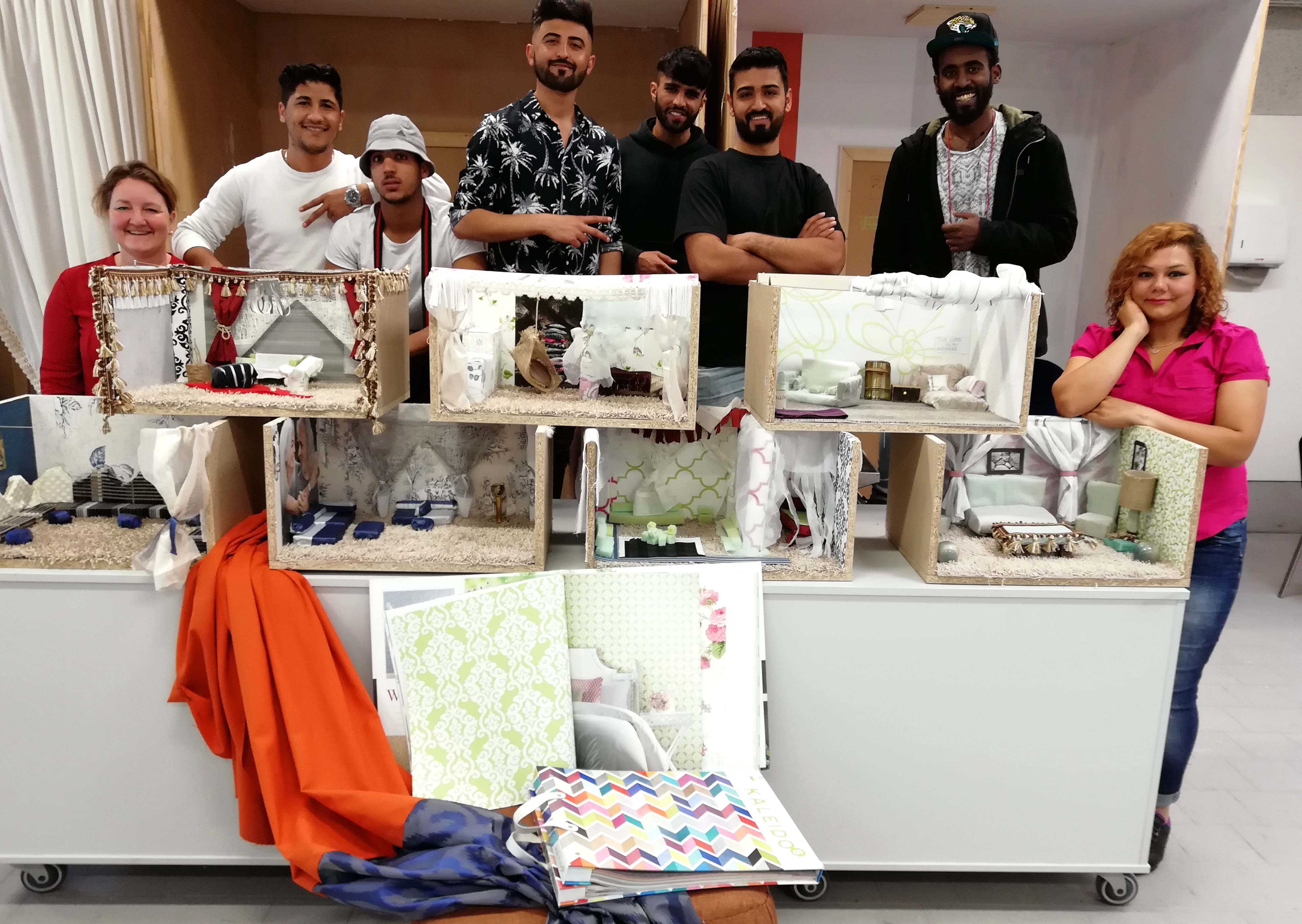 Stolz präsentieren die sieben Flüchtlinge aus dem Irak, Syrien, Afghanistan und Eritrea, ihre selbst gestalteten Zimmermodelle. Seit Anfang Juli verwirklichten sie sich in der Raumausstatter-Werkstatt. Vom gemütlichen Sessel bis zur ausgefallenen Wandgestaltung ist alles dabei.