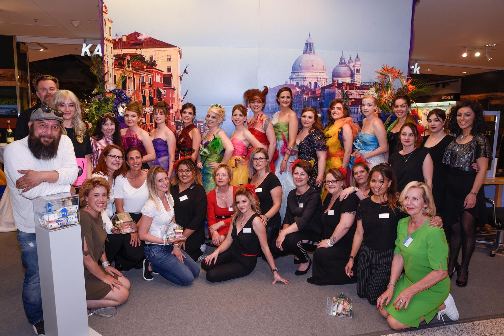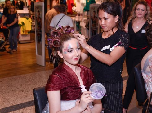 Drei Tage lang wurden aufwändige Hochsteckfrisuren vor den Augen der interessierten dez-Kunden kreiert und dem Motto entsprechend gesteckt, gesprayt und gestylt. Die Modelle wurden auch geschminkt, natürlich mit passendem Make-Up, das den besonderen Stil unterstrich. Frisuren-Hingucker und ausgefallene Looks der Modelle schmückten daraufhin die Einkaufspassage, die im venezianischen Stil mediterranes Flair versprühte.