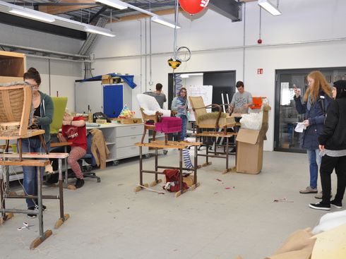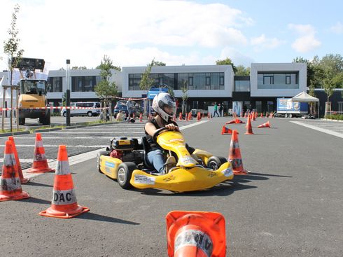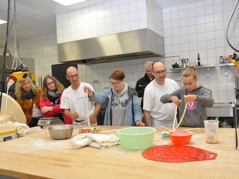 Nach der kleinen Stärkung am Bratwurststand konnte der Herstellung von Brötchen und Bratwurst nachgegangen werden: Bäcker- und Fleischerwerkstatt öffneten ihre Türen. Für wen es etwas aktiver zugehen durfte, der konnte mit den Maurern beim Kistenstapeln hoch hinaus klettern, sich bei den Elektrikern beim E-Fußballkickern versuchen oder sich beim Stand der KFZ-Innung als PS-Junkie im Rennsimulator austoben. Ganz persönliche Mitbringsel wurden in der CNC-Anlage im Fachbereich Metalltechnik hergestellt. Interessierte konnten sich einen BZ-Flaschenöffner auf Knopfdruck herstellen – frisch aus der hochmodernen Fräsmaschine.